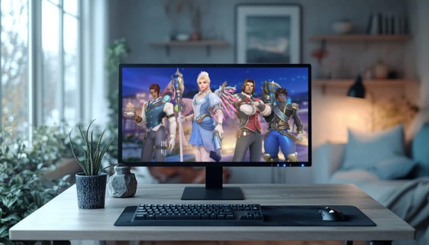 A desktop monitor in a cozy home office displaying Overwatch 2 characters in Palace Royals skins, including Mercy, Lifeweaver, Lucio, and Hanzo.